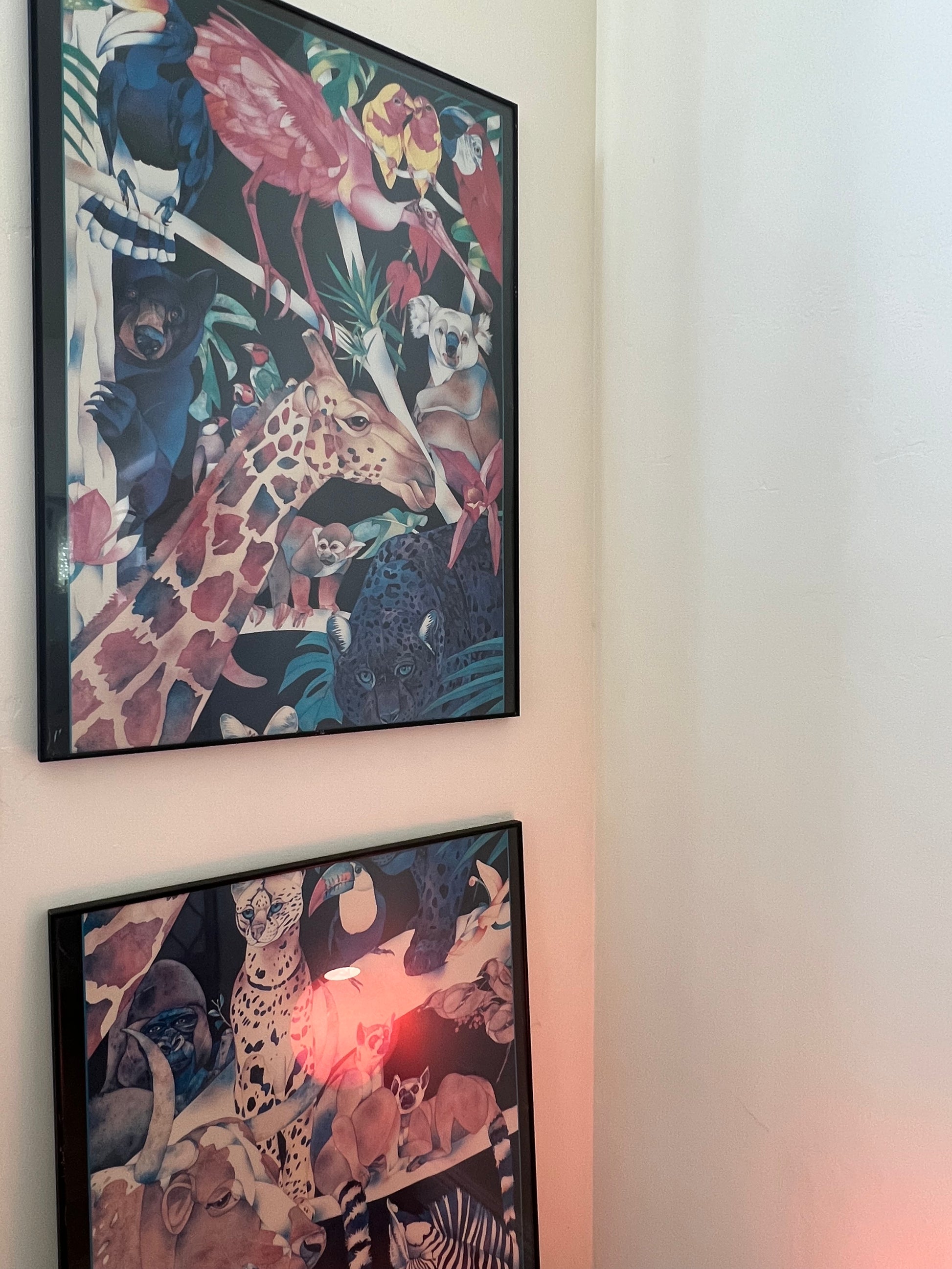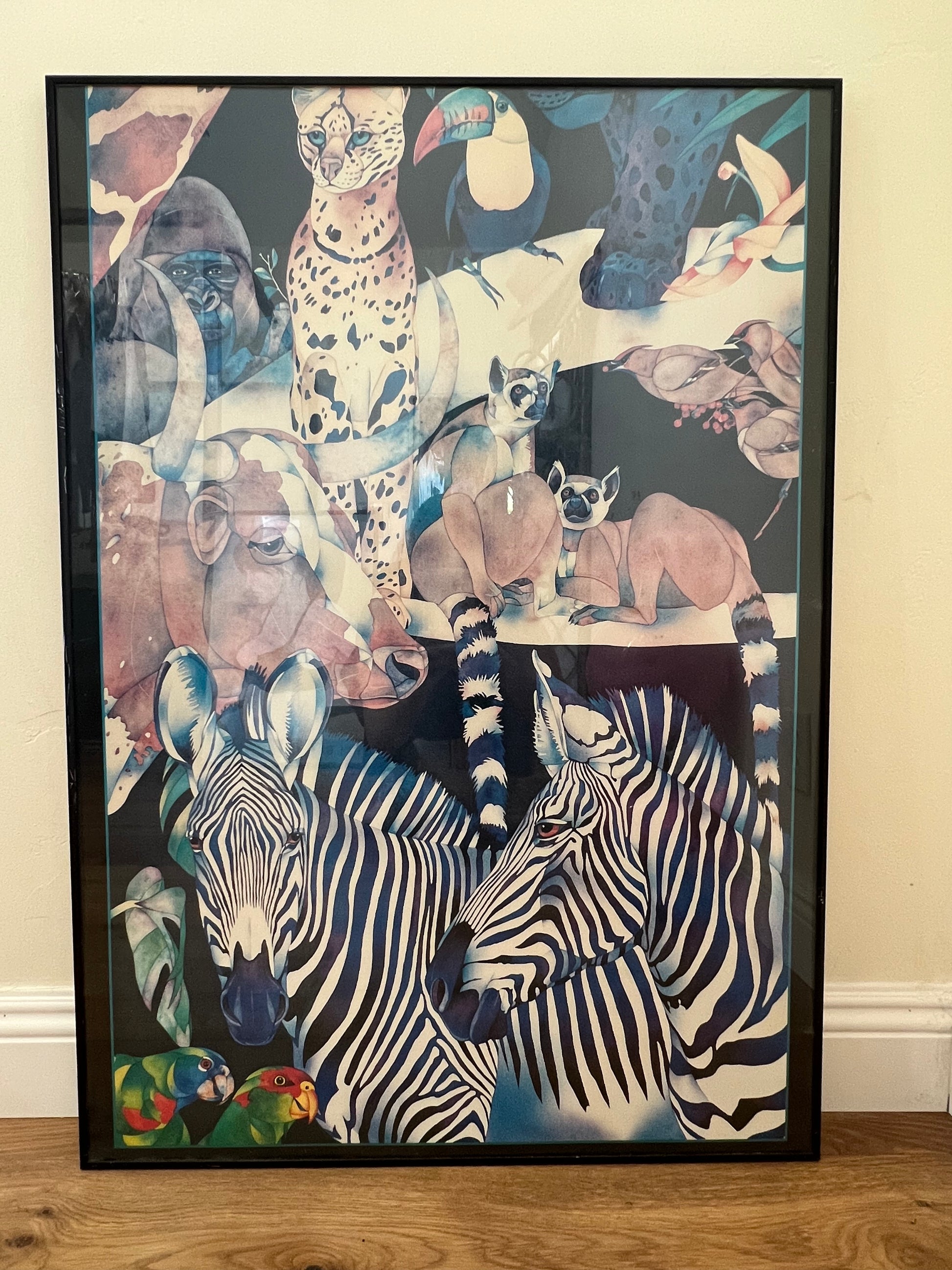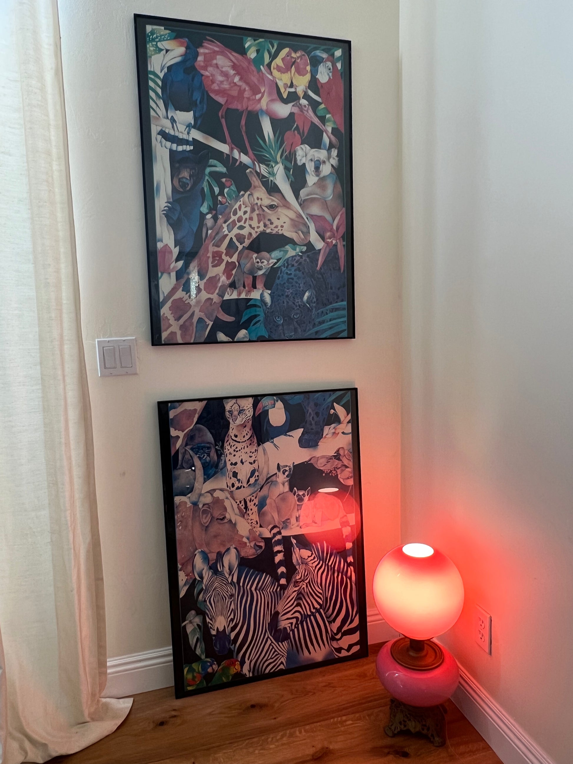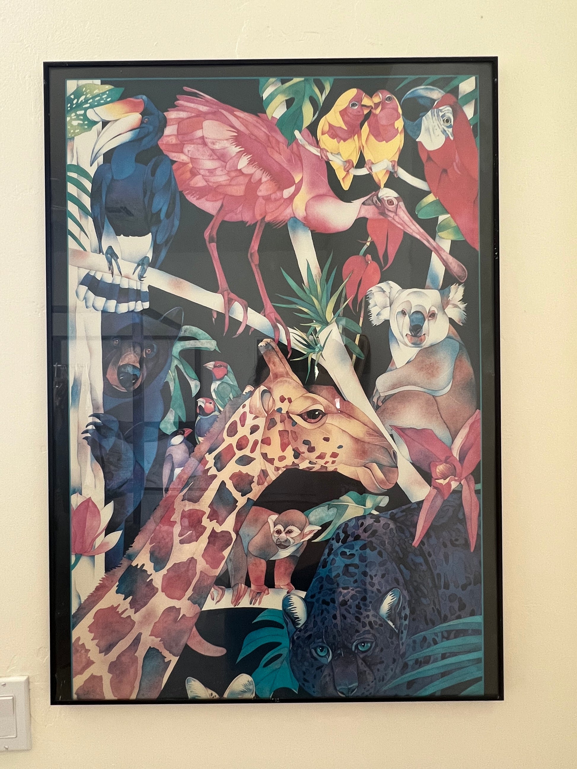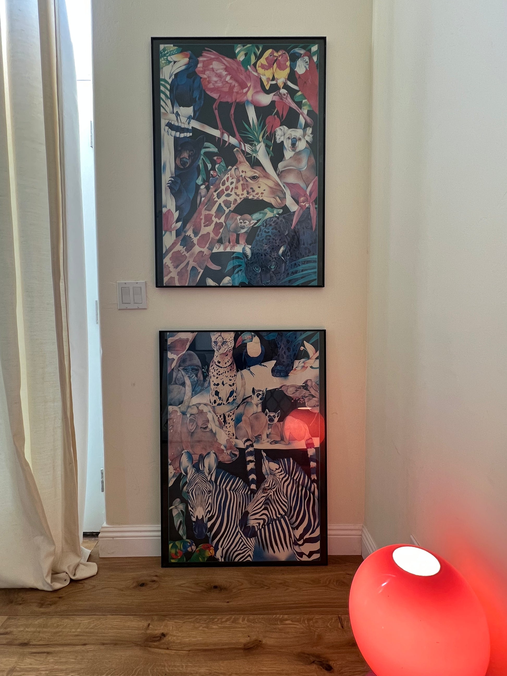 Bring a bit of the wild side into your home with our Watercolored Jungle Print Set! Featuring vintage Michael's watercolor prints of adorable animals set in a tasteful black frame, this set is sure to brighten up a room. Hanging apparatus attached on the backs.