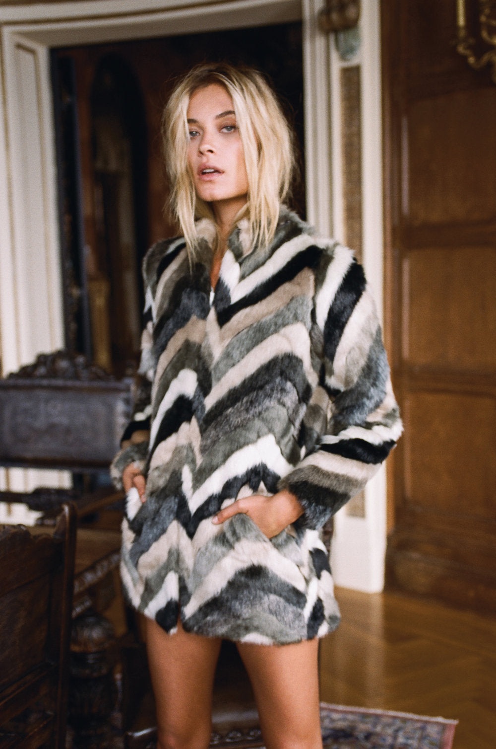 Trust us when we say you won't need to borrow your boyfriends jacket when you're rocking this Amuse faux fur chevron pattern coat. A solid choice for formal events or if you're often inspired by Carrie Bradshaw like us, we aren't against wearing this out to the grocery store.