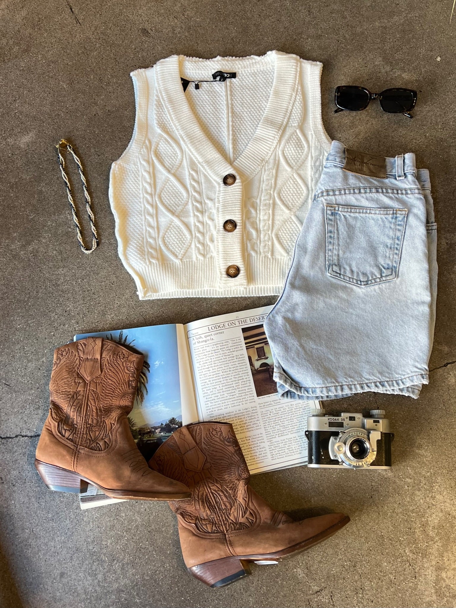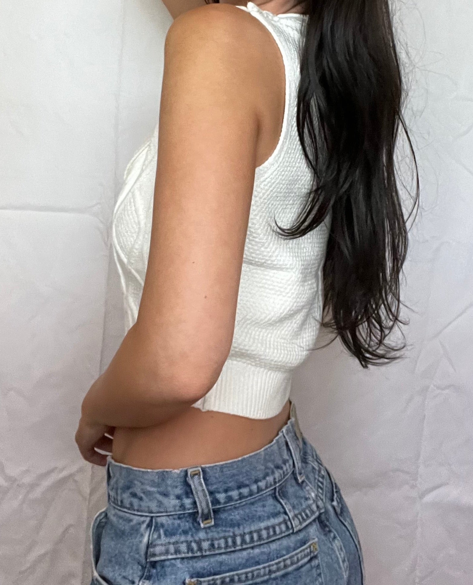 The perfect piece to add to your winter whites! V neck cropped knit sleeveless sweater vest with tortoise shell brown buttons. Buttons can unbutton fully. Size up for a boxy chunky look.