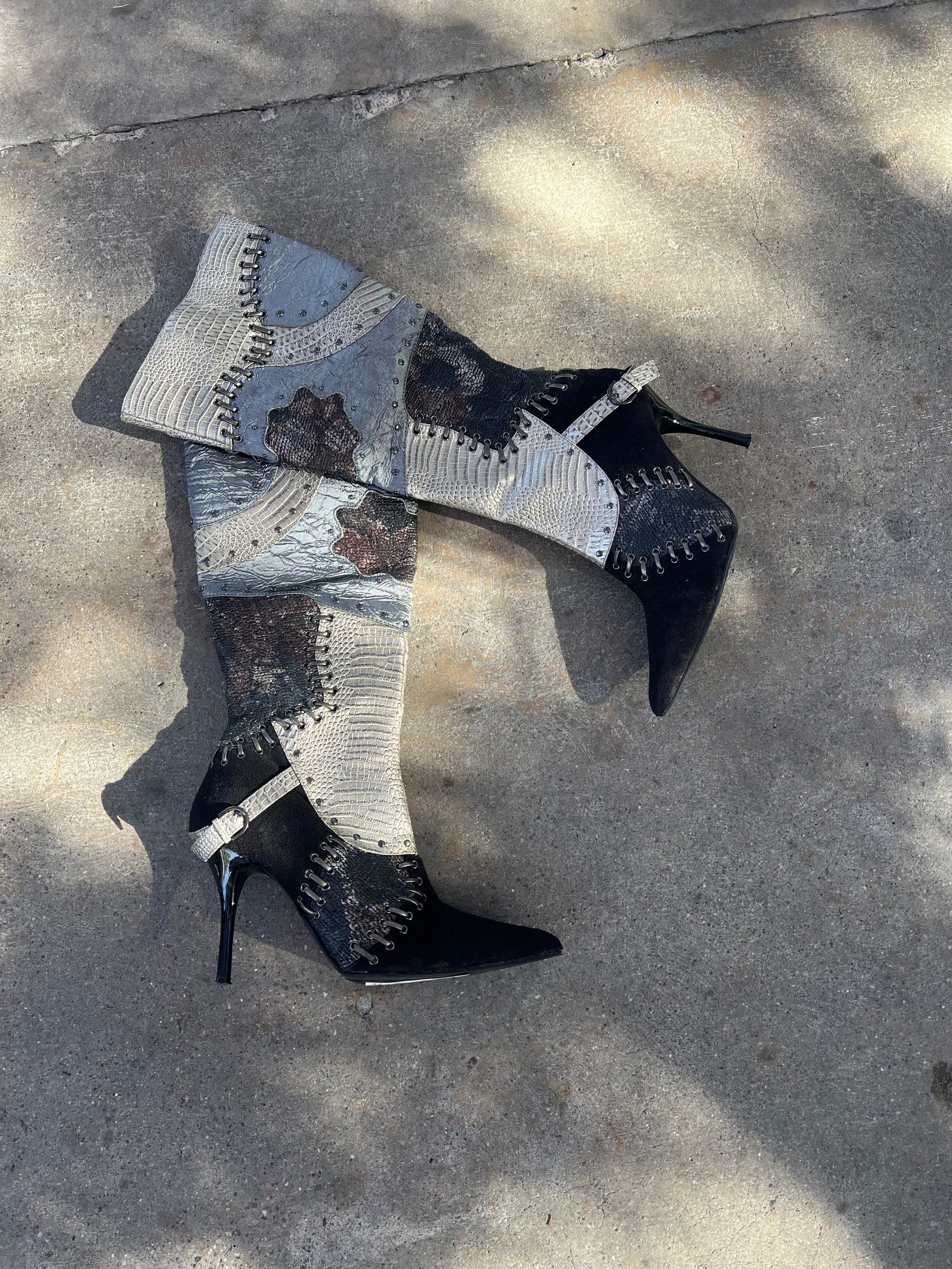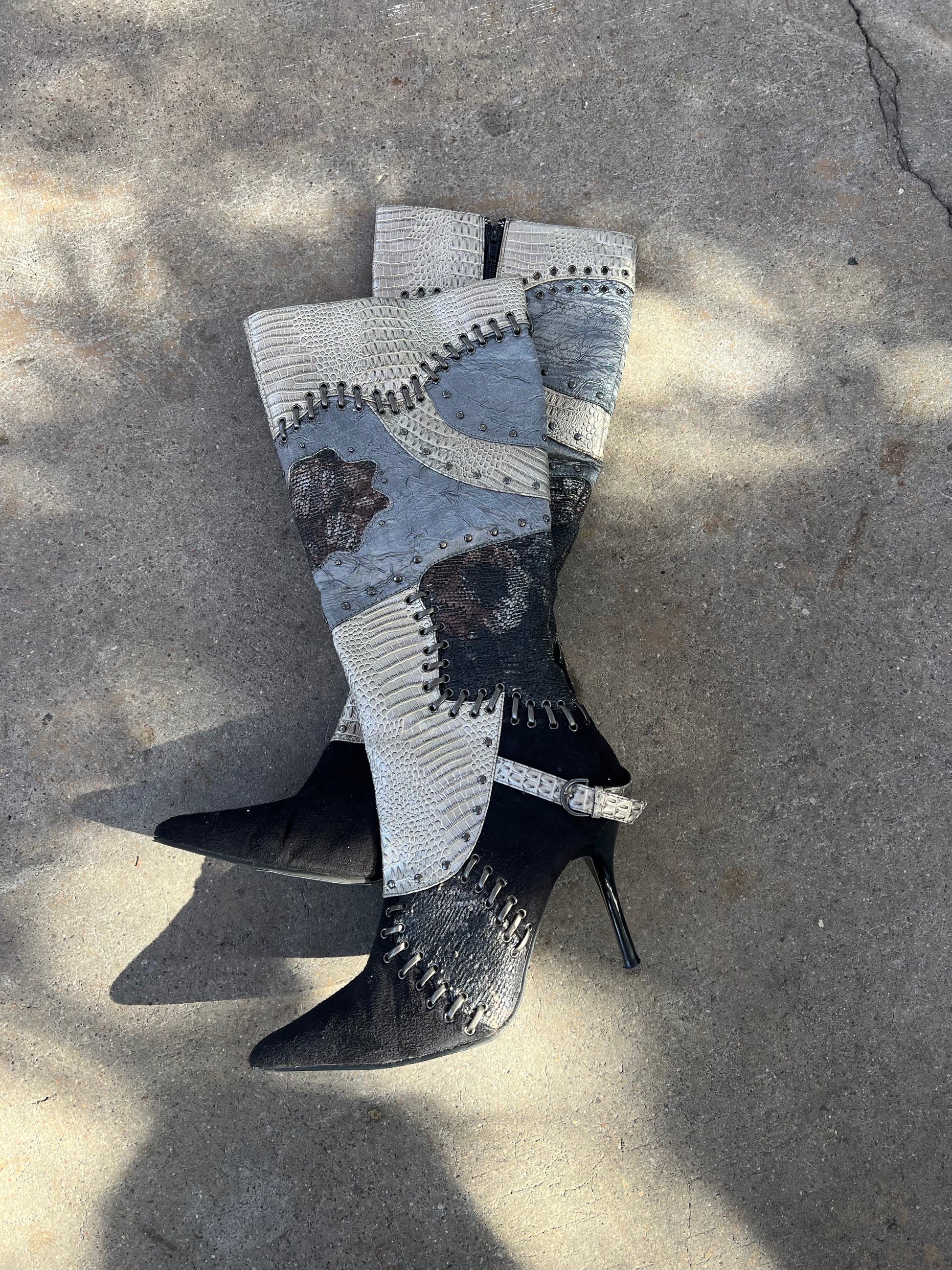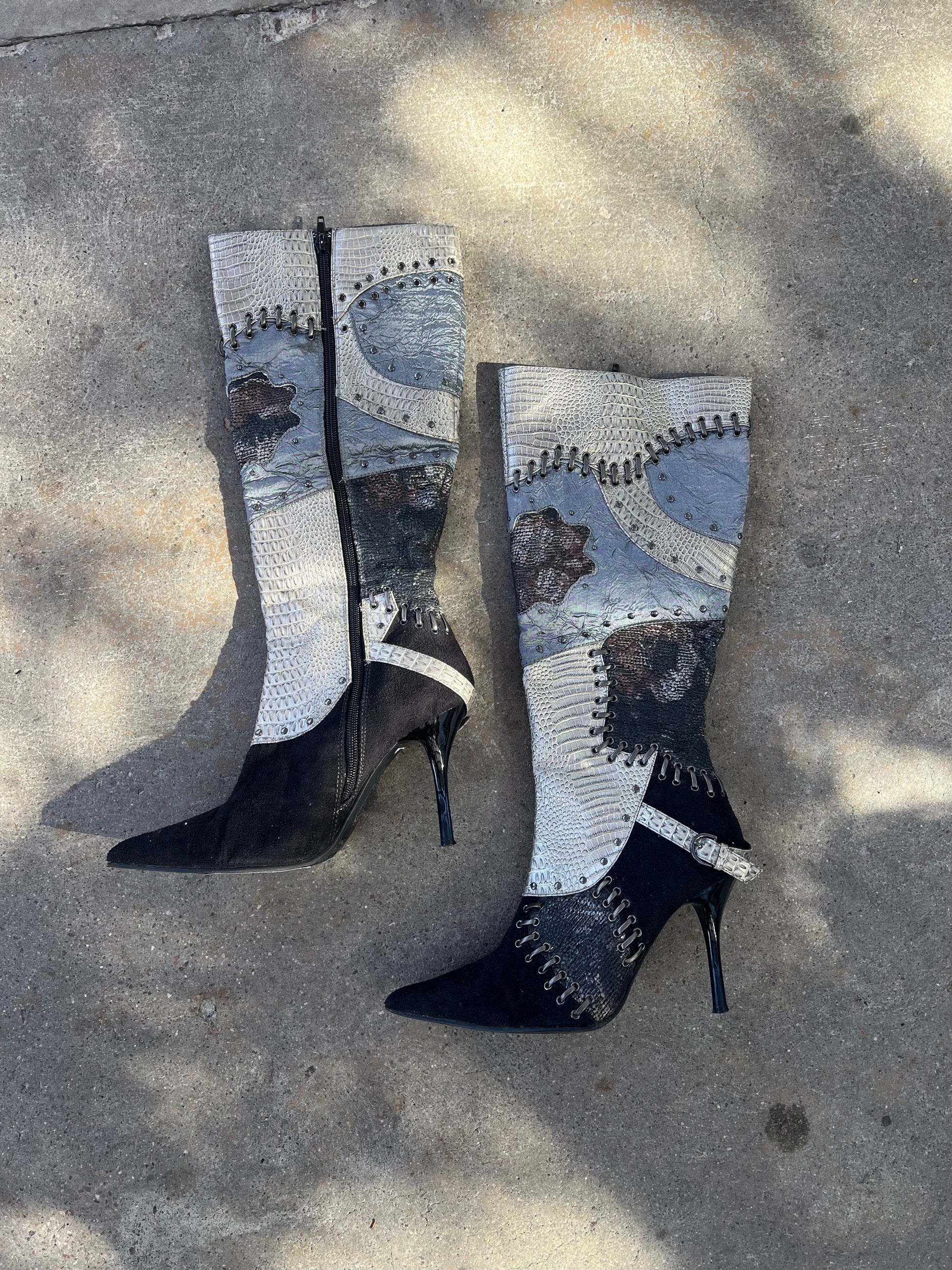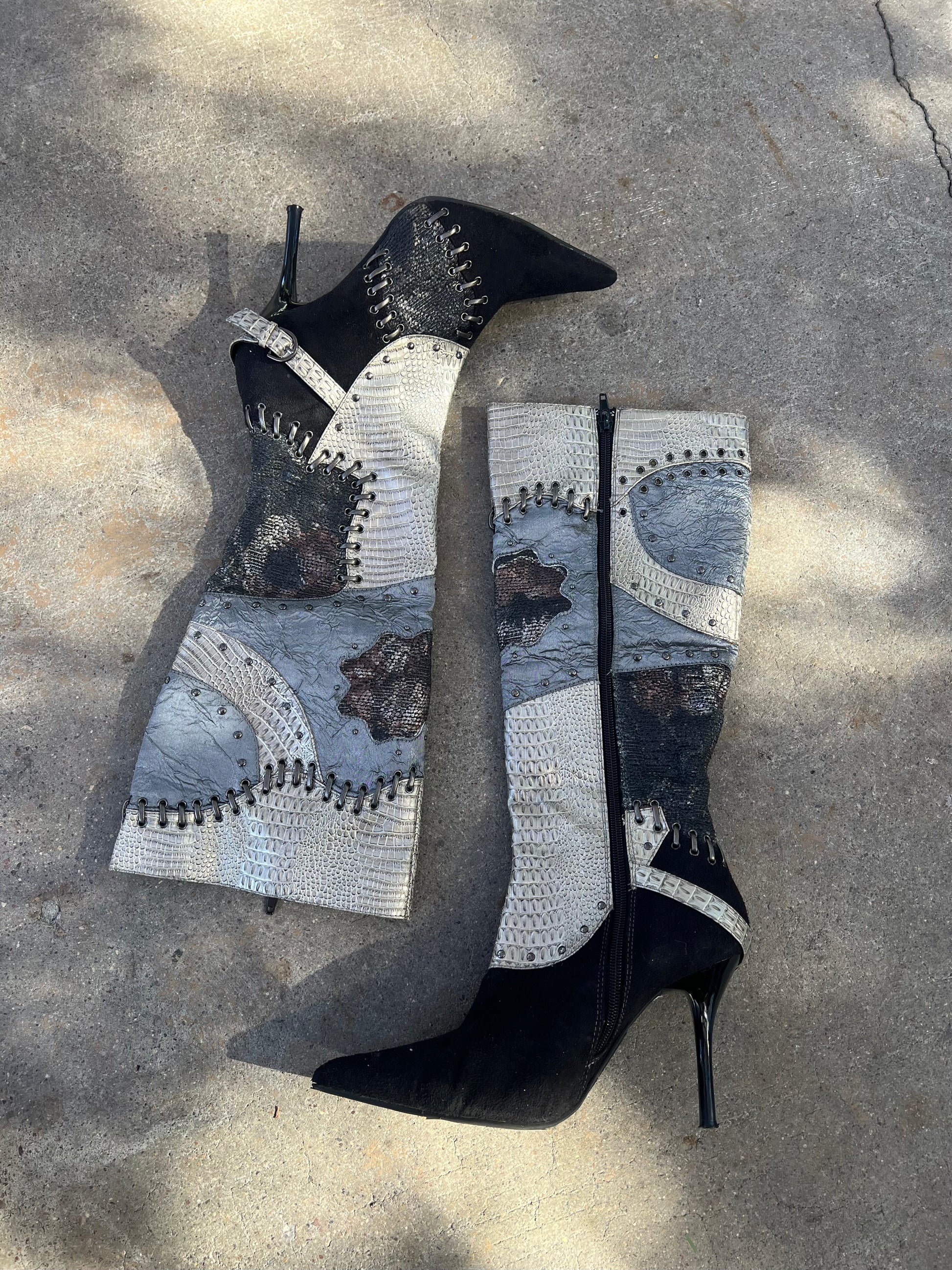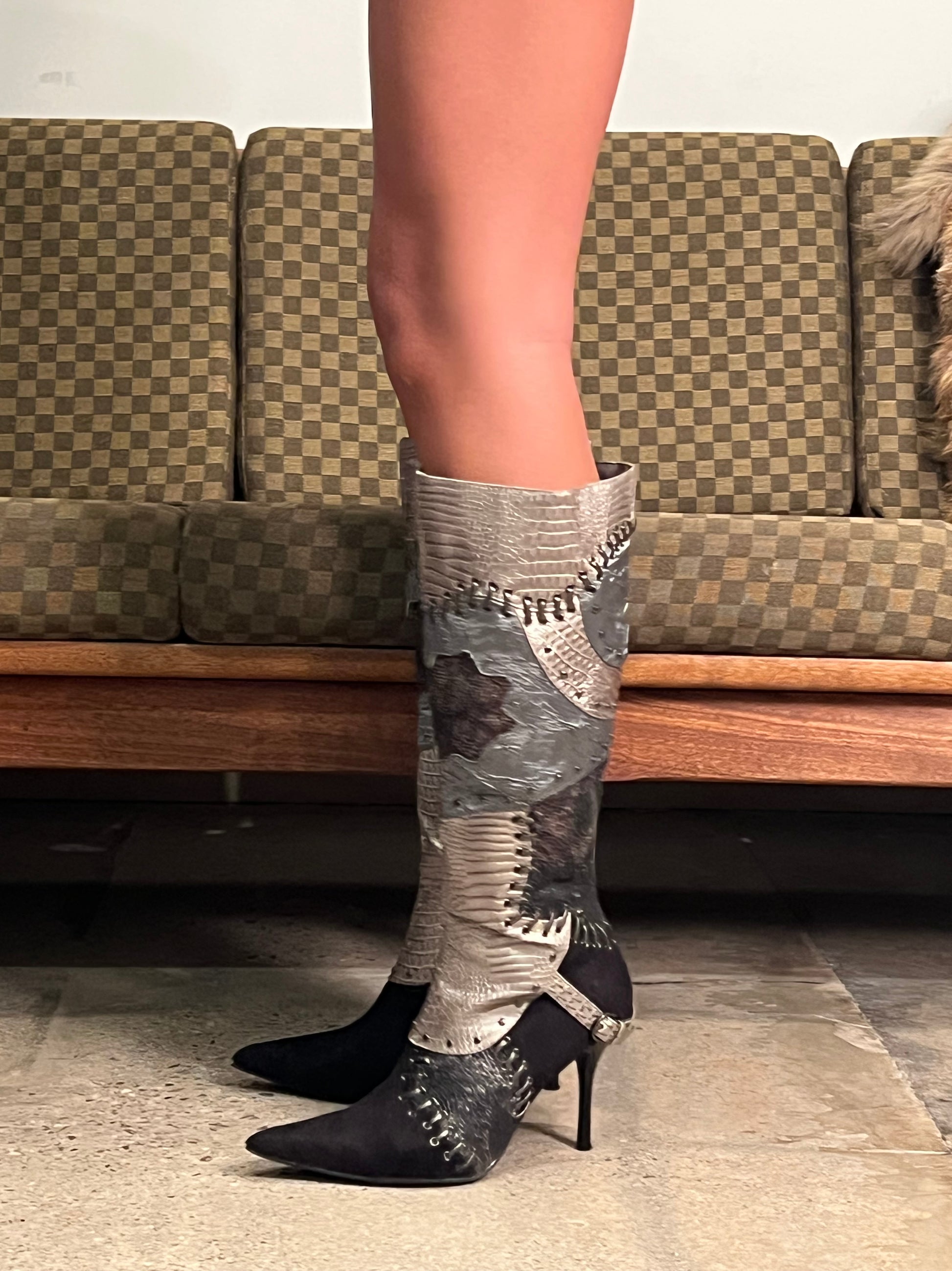 Amazing multi color and fabric patchwork knee boots with pointed toe and stiletto heel. Zipper closure.