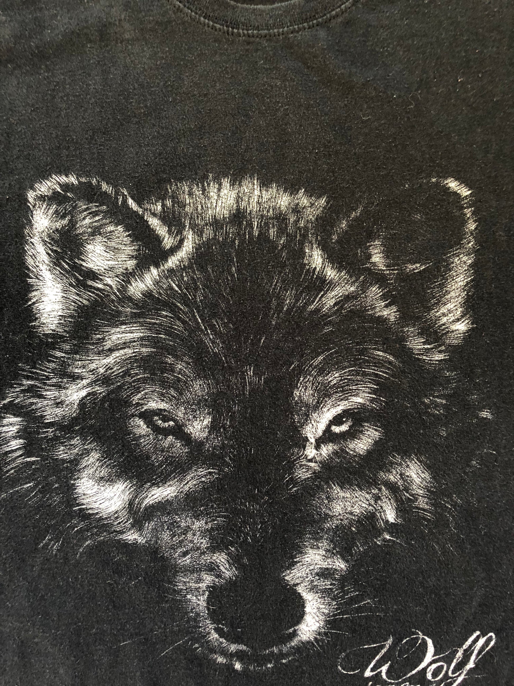 Black cropped T-shirt with wolf face graphic. Printed on a Gildan T-shirt size Medium