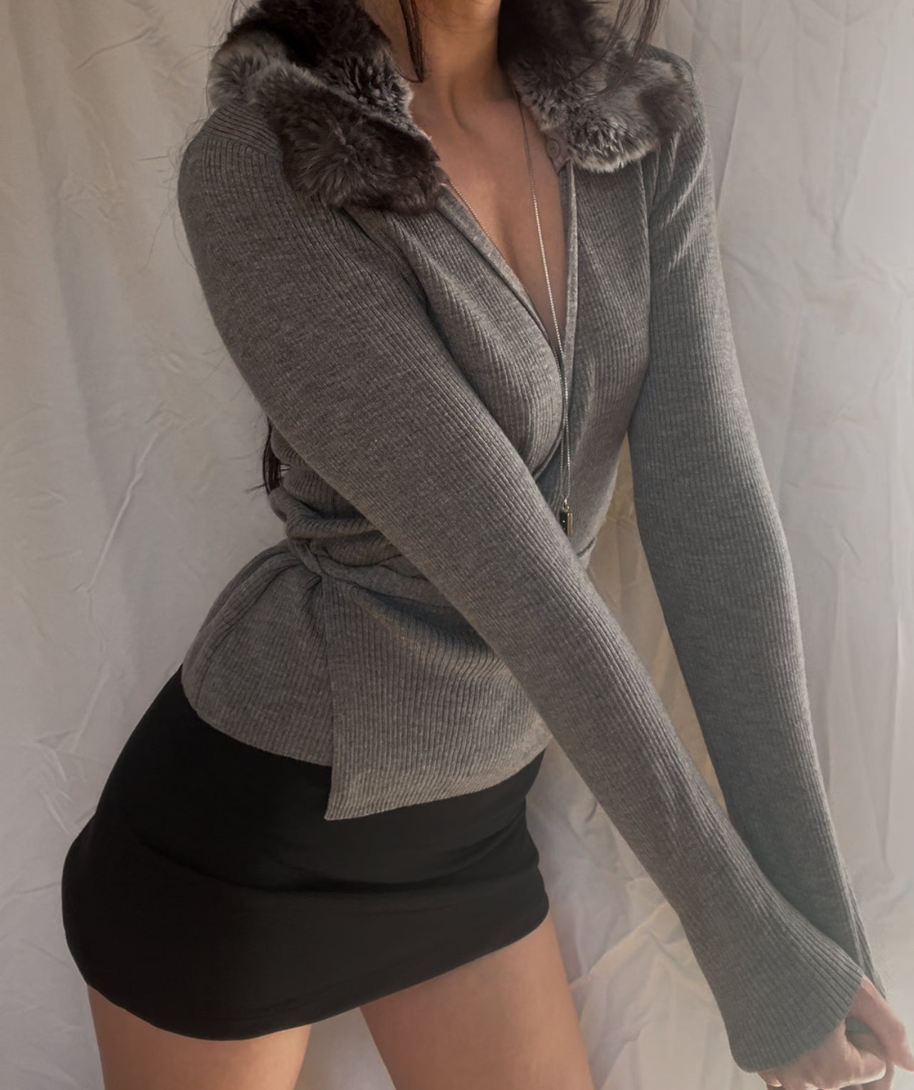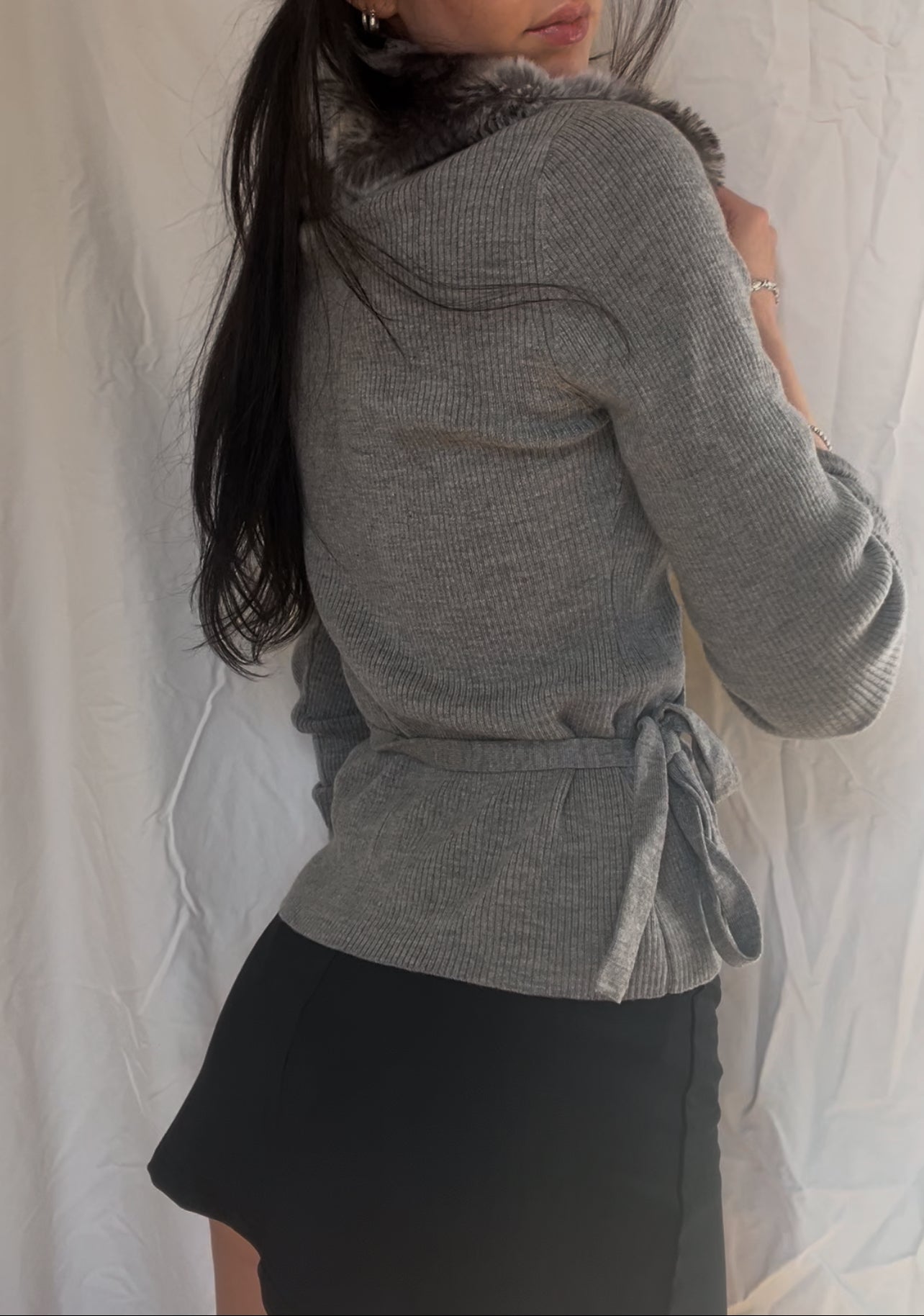 Vintage wool, grey knit long sleeve wrap top cardigan with removable faux fur collar. This item has a few small holes. Selling as-is.