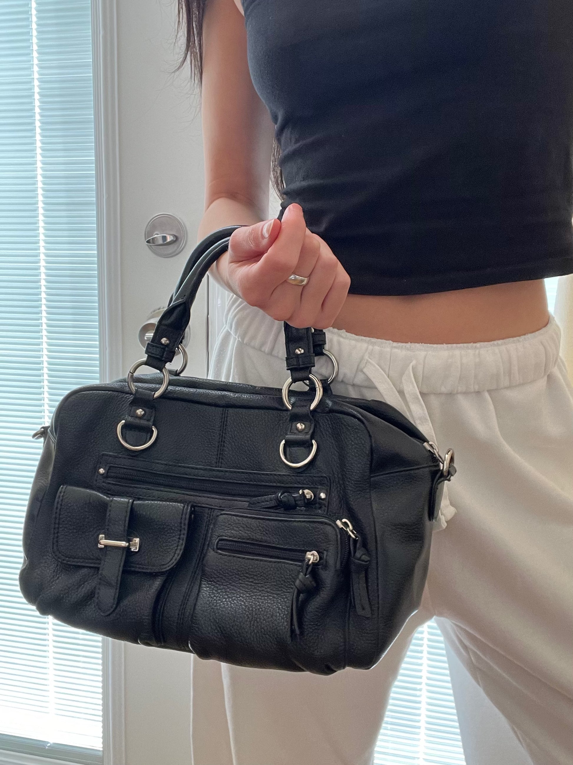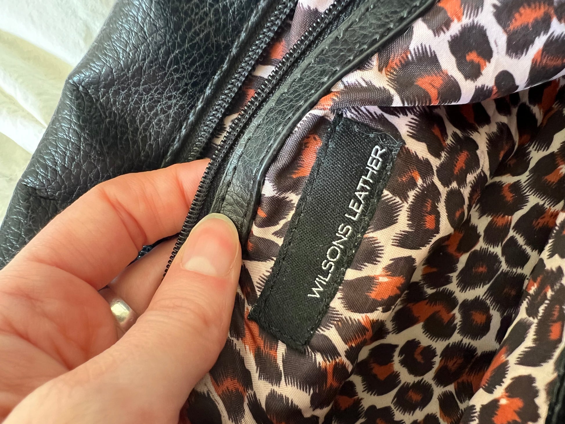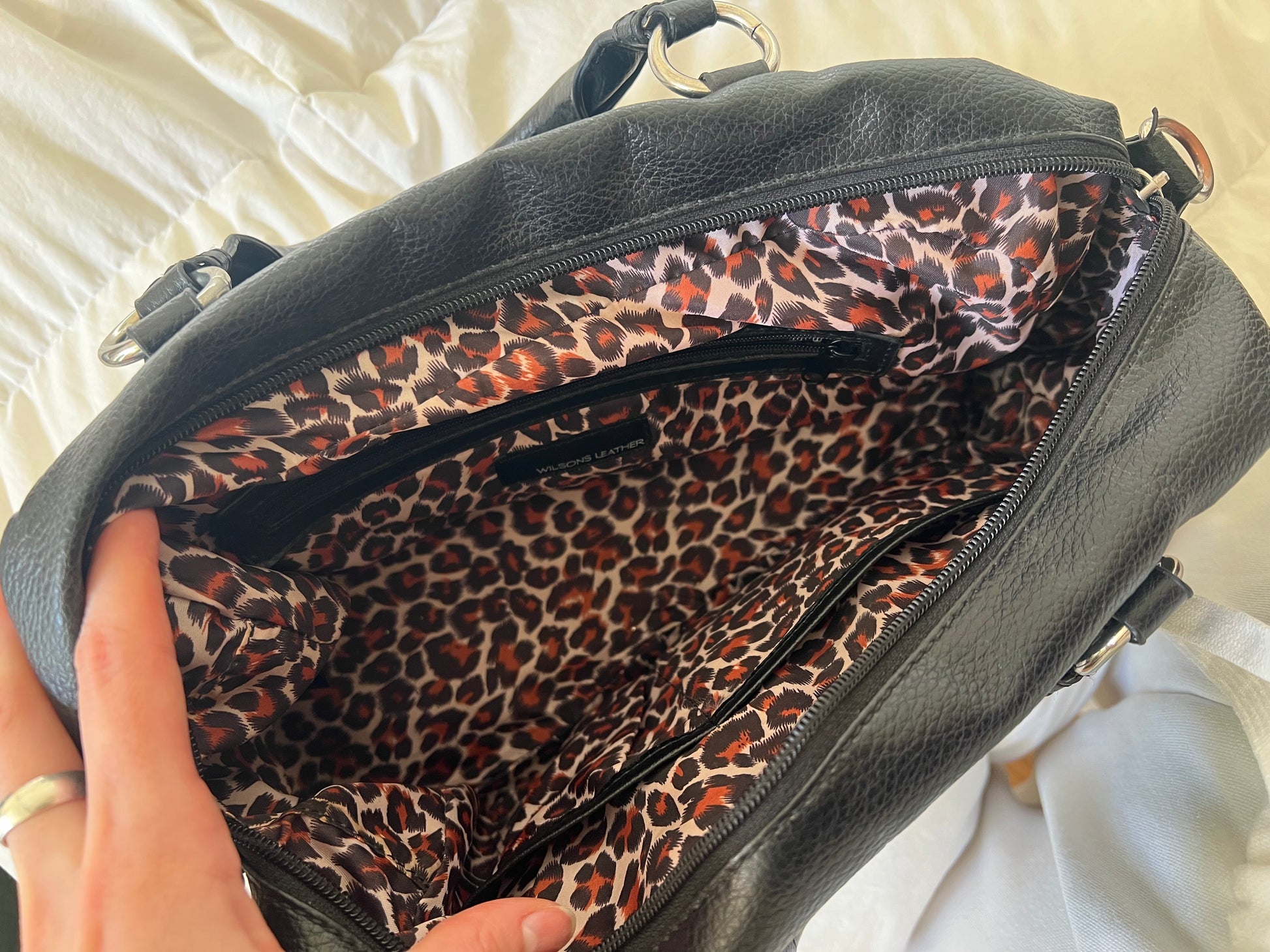 Genuine leather black cargo bag with silver hardware. This purse is from Wilson’s Leather and has a cheetah print interior lining. With amazing pockets and zippers on the front, this bag is a killer statement piece. Comes with detachable crossbody strap.