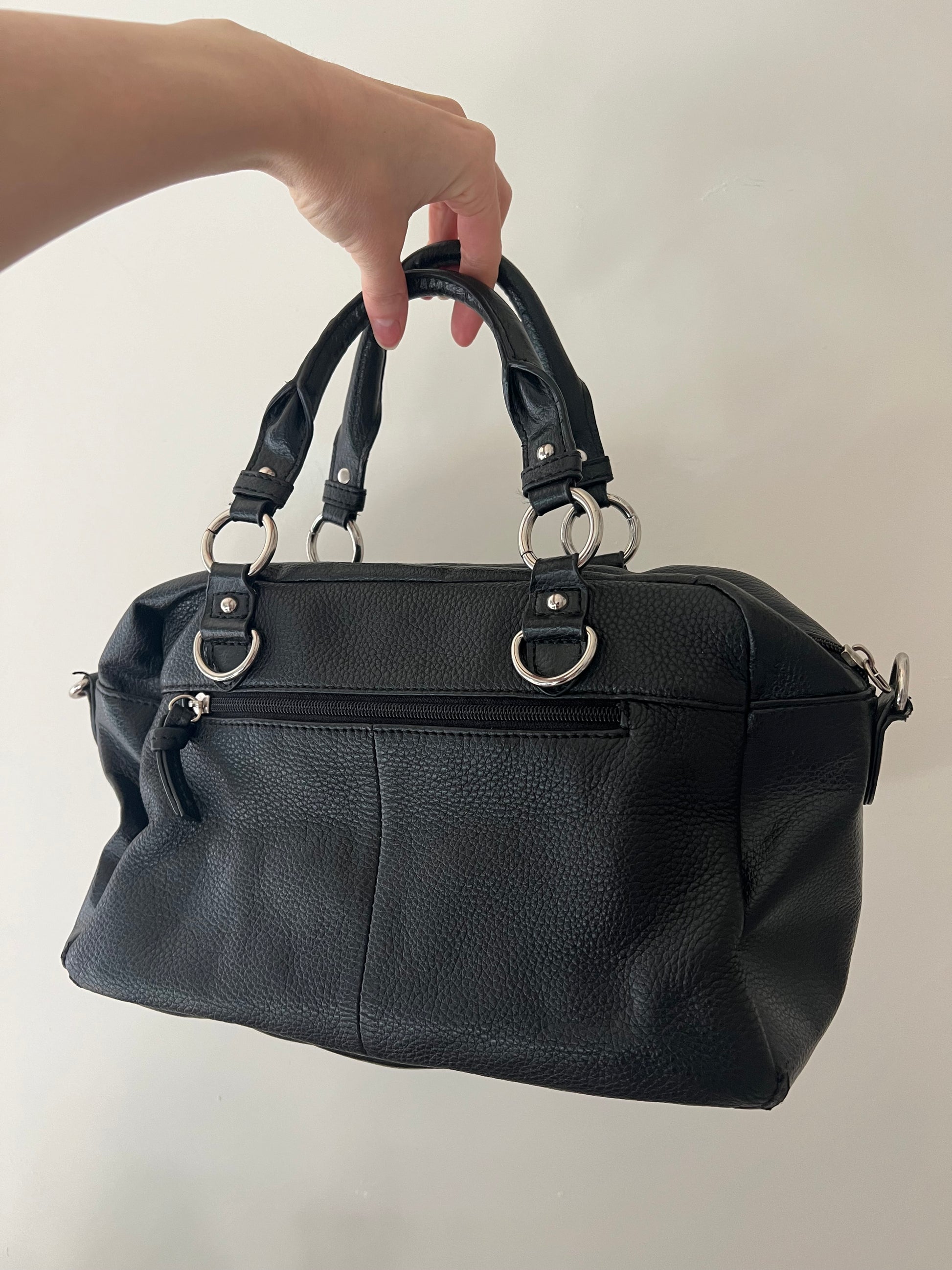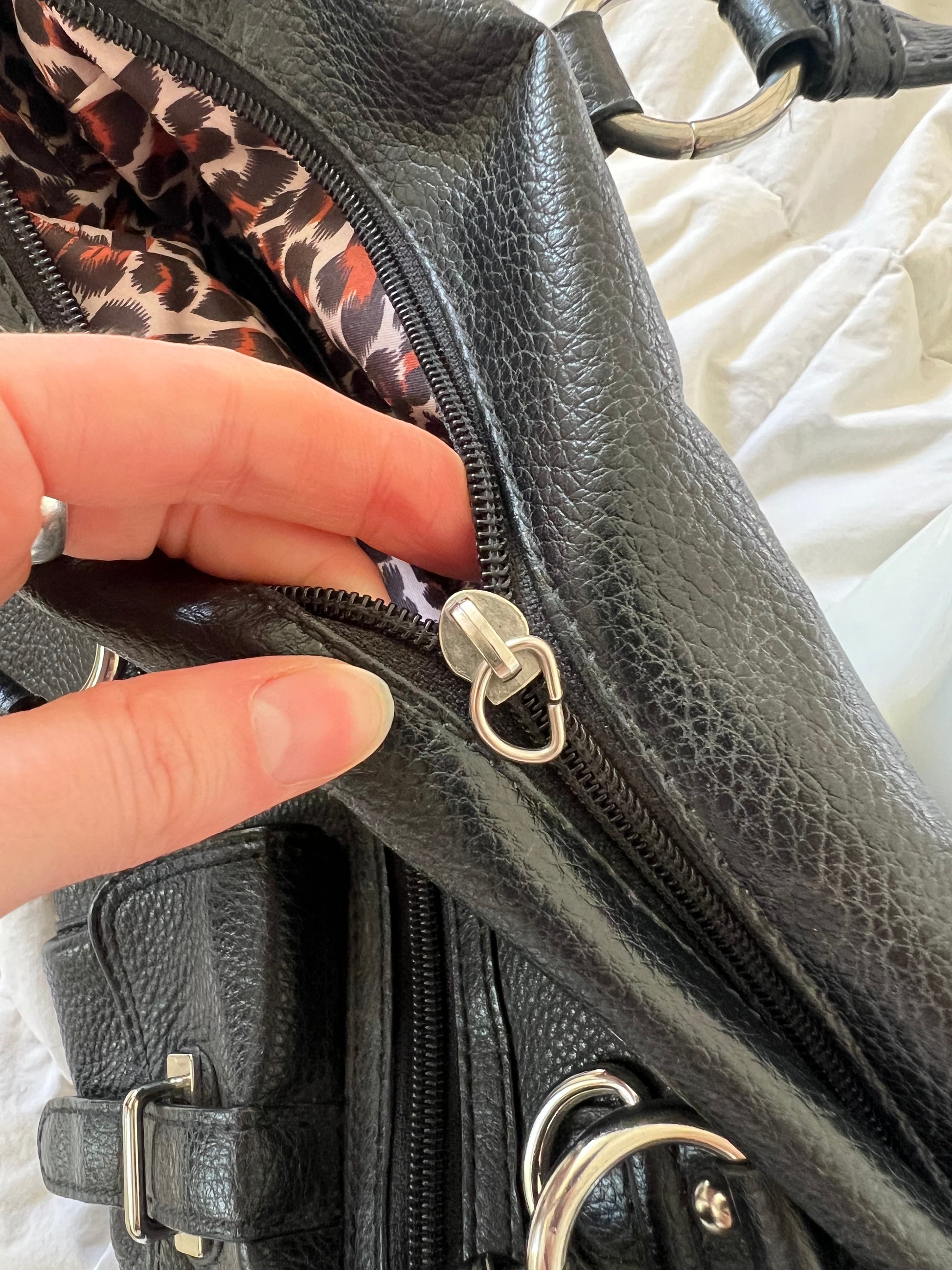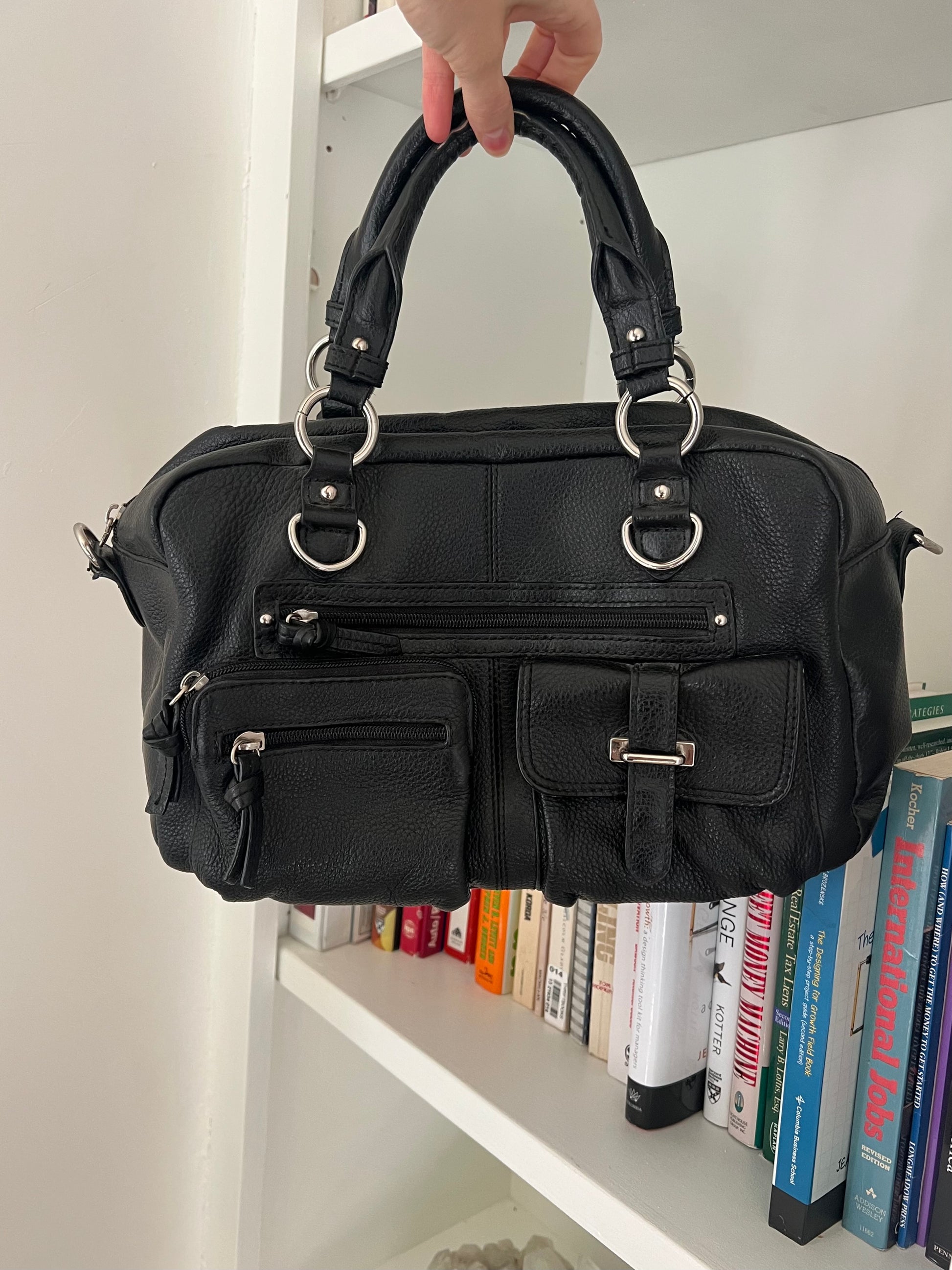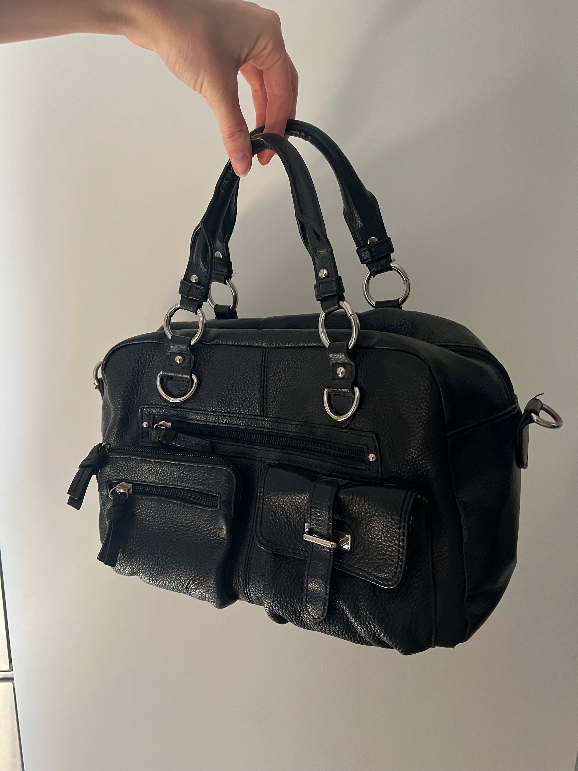 Genuine leather black cargo bag with silver hardware. This purse is from Wilson’s Leather and has a cheetah print interior lining. With amazing pockets and zippers on the front, this bag is a killer statement piece. Comes with detachable crossbody strap.