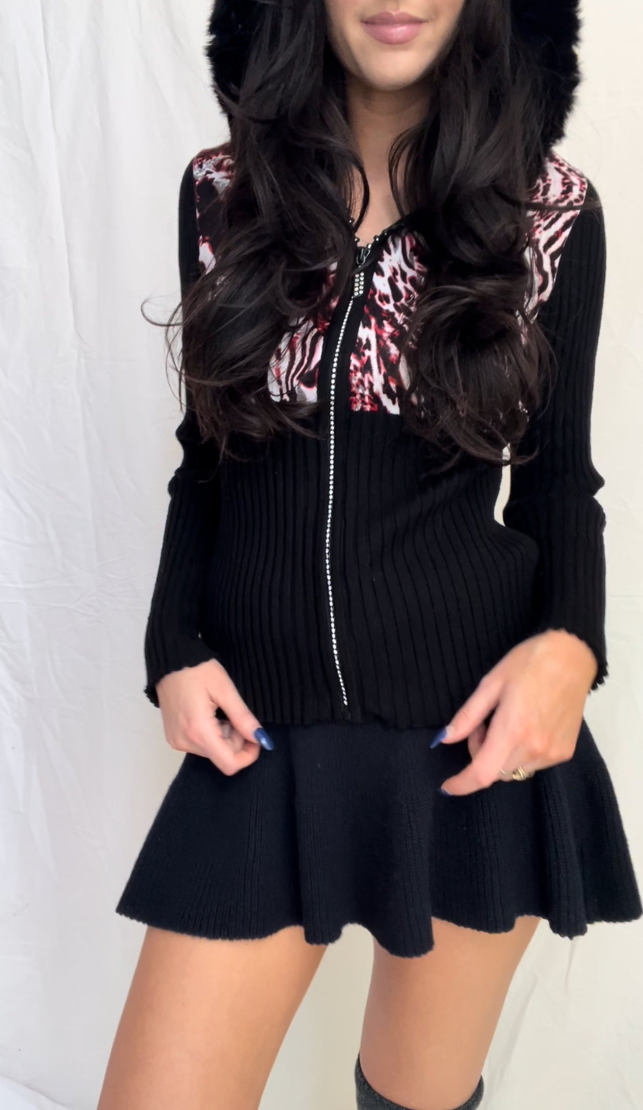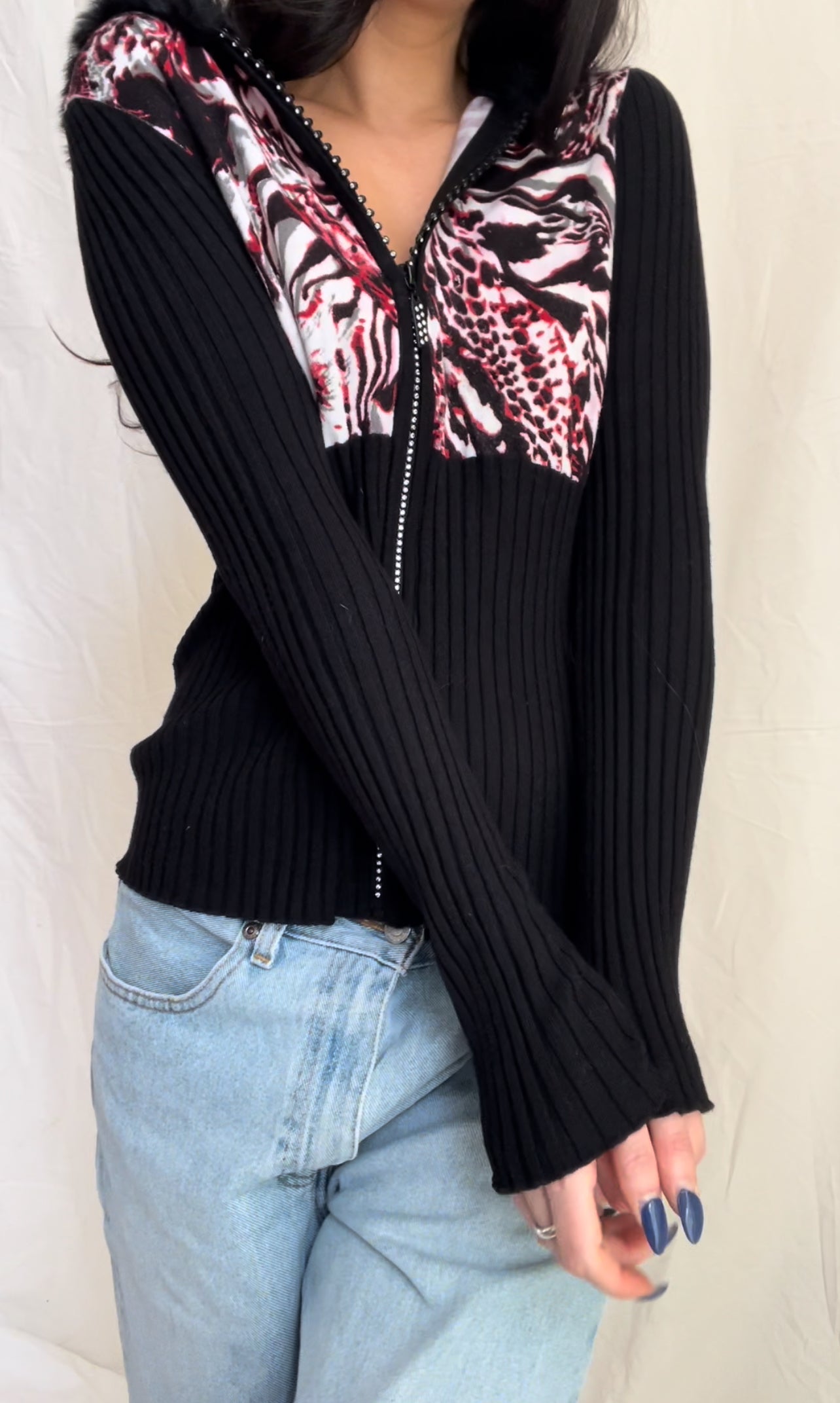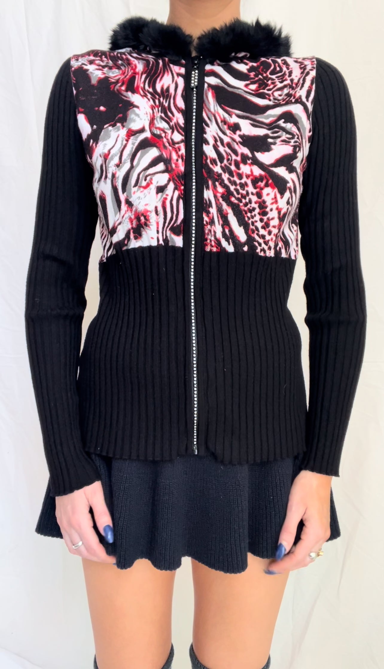 Adorable 2000’s era zip up sweater cardigan with black rabbit fur lined hood. Featuring a rhinestone studded zipper, ribbed arms, and red leopard print body and genuine fur lined hood.