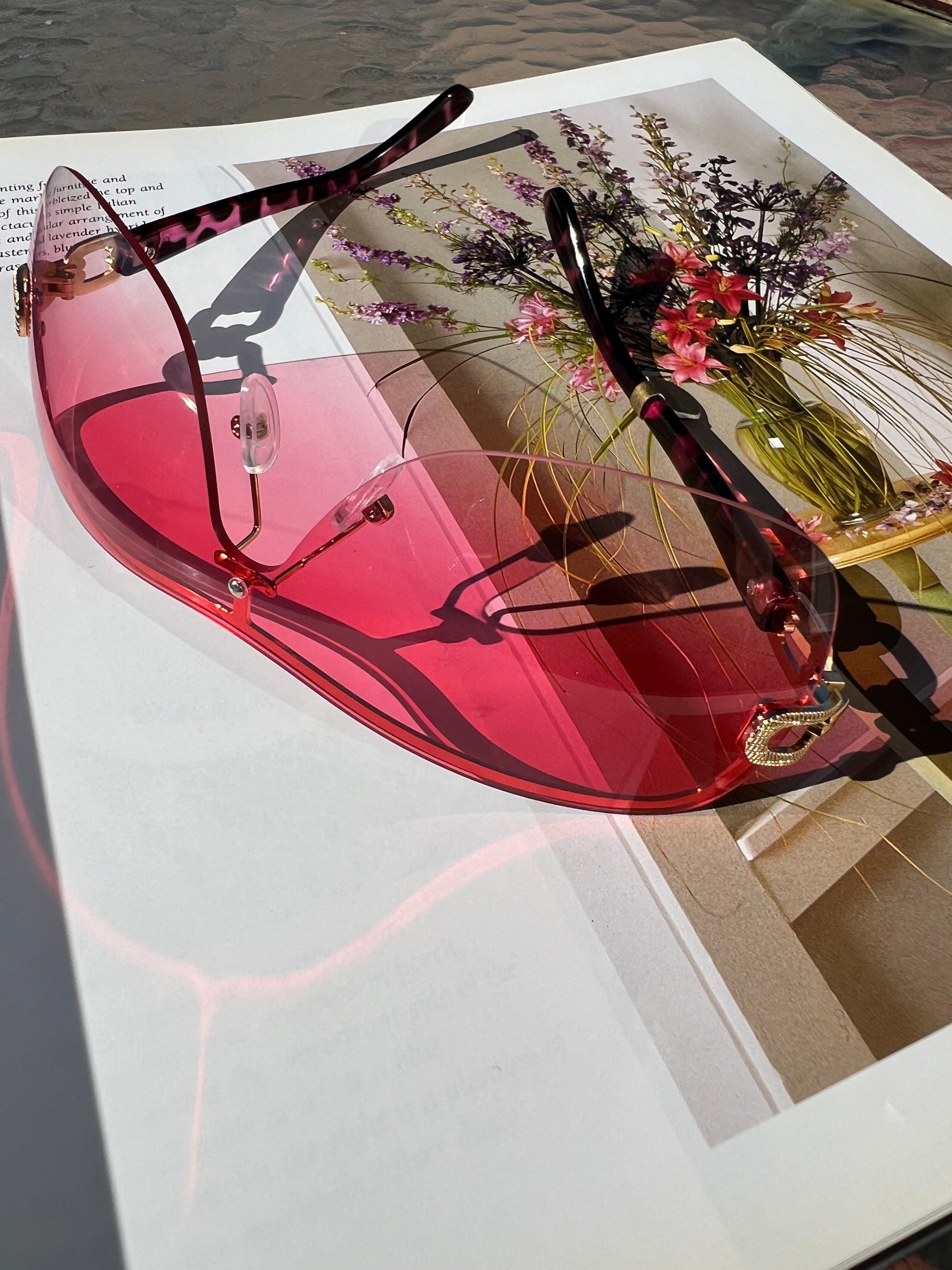 Pink ombre lens y2k style sunglasses with leopard arms and gold hardware